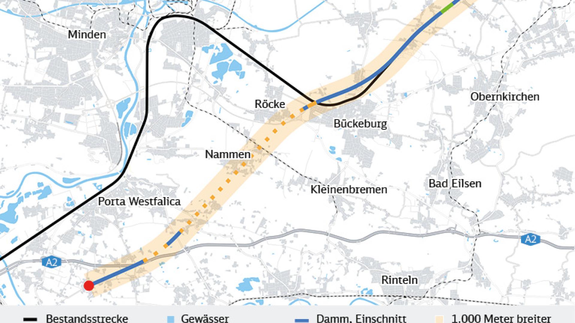 Die Darstellung zeigt den Verlauf von S2.2 zwischen Seelze und Lindhorst. Die blaue Linie, die von Haste nach Bad Nenndorf verläuft, zeigt Anpassungen, die an bestehenden Gleisen für die S-Bahn nötig sind. Die Anpassungen gehen in die Bewertung der Belanggruppe Technik ein.