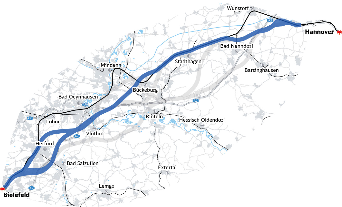 Als Nächstes planen wir die zwei Varianten V3 und V4 sowie jeweils zwei Anbindungen bei Hannover und Bielefeld genauer. Diese Planungsphase heißt Vorplanung. Wir ermitteln mehr Informationen zum genaueren Verlauf der Varianten und zu den nötigen Bauwerken. Wir untersuchen Bauzeiten, Schallschutz und Eingriffe in die Natur. Zudem finden Gespräche mit unter anderem den beteiligten Behörden, Umweltverbänden und Anwohnern statt.