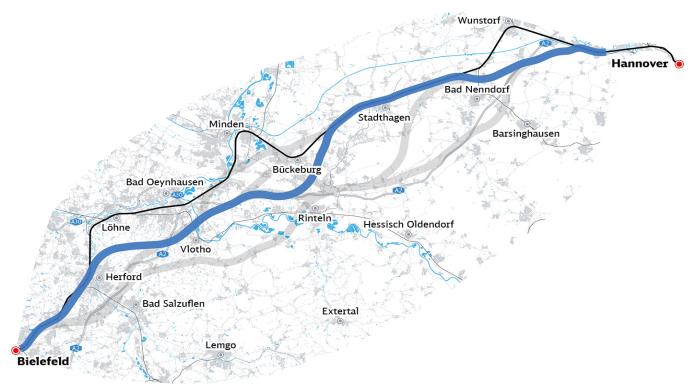 Bei Variante V6 ist die Strecke zwischen Hannover Hauptbahnhof und Bielefeld Hauptbahnhof 101 Kilometer lang. Wir nutzen 11 Kilometer Bestand und planen 90 Kilometer neu. Diese 90 Kilometer haben Fachleute bewertet und mit den anderen Varianten verglichen. Die Ergebnisse des Varianten-Vergleichs finden Sie hier.